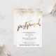 Se você precisa notificar sua tribo sobre uma data de casamento atualizada, este design festivo pode ser exatamente o que você está procurando! Neste design, a fonte de letra manuscrita foi usada para criar um gráfico que lê "adiado", grande e em negrito; a imagem foi embelezada com um efeito dourado metálico falso. A parte superior de ambos os lados foi acentuada com uma imagem que simula confetes dourados que parecem cair de cima. Use os campos do modelo para adicionar seus detalhes pessoais e tornar este design moderno e único seu. O fundo pode ser alterado para qualquer cor que você preferir. // 100 //