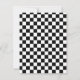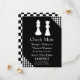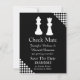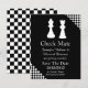 Anúncio de casamento em preto e branco feito em tema de jogo de xadrez. As silhuetas das peças de xadrez Rainha e Rei brancas decoram o topo do anúncio preto, com os cantos superior direito e inferior esquerdo feitos em xadrez preto e branco. O texto em branco está pronto para ser personalizado com as informações do seu casamento. Ótimo anúncio para o casal que ama xadrez.