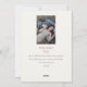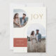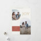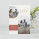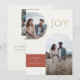 Os cartões de felicitações planos de 5" x 7" apresentam espaços reservados para três fotos, dois nomes, ano e uma mensagem. A frente tem duas fotos arqueadas, uma vertical e uma horizontal. A saudação é "Joy" (Alegria), em letras douradas. O fundo é marfim com uma caixa de tijolo adobe vermelho envolvendo os nomes do casal. O verso tem uma foto vertical. A mensagem personalizável diz: "Estamos emocionados em anunciar que ficamos noivos, e ambos desejamos a você paz e alegria durante as festas de fim de ano e no ano que vem."