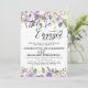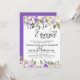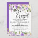 Belas rosas ultravioletas se misturam com flores brancas cremosas para criar um belo design floral. Eles estão noivos está escrito em um grande script fluente. O restante do texto é uma fonte serif clássica. A parte de trás do convite é tão bonito quanto a frente. É um roxo real rico com os pequenos pontos brancos. O design floral da frente continua atrás. O texto é fácil de personalizar.