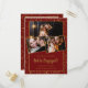 Confetes dourados decoram o fundo vermelho burgundy na frente e no verso. Três fotografias do casal são apresentadas na frente. Todo o texto abaixo inclui o grande Estamos Noivos que pode ser editado para personalizar seu anúncio de noivado exclusivo.