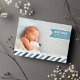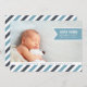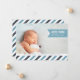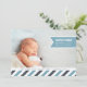 Adicione sua foto de recém-nascido orientada à paisagem favorita a este anúncio moderno de sangramento de cheio e compartilhe sua alegria com amigos e familiares. Design apresenta o nome do seu bebê, data de nascimento e estatísticas de nascimento em uma faixa azul-céu, com sua saudação familiar exibida em uma borda inferior de faixas diagonais em branco, marinho e azul-céu.