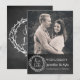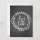 Anúncio divertido e rústico de salvar a data de casamento com visual de quadro negro, com foto personalizada no topo do cartão e um visual de quadro negro cinza carvão na parte inferior. Gráficos de uma grinalda com texto que diz Salve a Data decoram a parte inferior. Texto branco personalizado está pronto para ser personalizado com sua foto e informações. Uma maneira encantadora de anunciar seu próximo casamento.