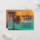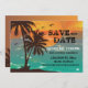 Um belo design tropical com águas turquesa e um grande pôr do sol. Envie um anúncio de Save the Date com cartão atraente.