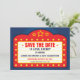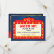 Um anúncio de salve a data muito divertido que apresenta um letreiro de cinema com os nomes da noiva e do noivo como a estrela de seu próprio filme. No verso do anúncio há uma tela de cinema com pessoas sentadas na plateia em silhueta, adicione suas fotos de noivado à tela para que você possa ser a estrela de seu próprio filme. O nome do filme pode ser alterado para qualquer coisa, pois o cartão é totalmente personalizável.