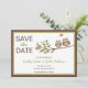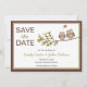 Convites de save the date caprichados com dois adoráveis corujas empoleirados em um galho com um coração em um balão de diálogo acima deles. Borda marrom e verde em um fundo branco. Personalizado com suas informações no espaço fornecido. Obtenha os selos de Save the Date da Coruja correspondentes abaixo: