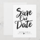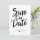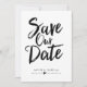 Este design apresenta as palavras "save the date" em letra manuscrita preta e negrito. Os nomes do casal e os detalhes do casamento são exibidos abaixo e podem ser personalizados.