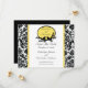Anuncie seu futuro casamento com nossos cartões de anúncio Save The Date com um belo padrão damasco preto e branco com acabamento amarelo e uma moldura oval com 2 pássaros e galhos. Basta adicionar as informações do seu casamento e você estará pronto! Selos postais e selos de envelope correspondentes disponíveis em nossa loja