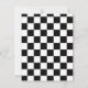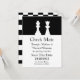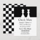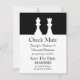 Anúncio de Save The Date de casamento preto e branco feito em um tema de jogo de xadrez. As silhuetas de uma rainha branca e uma peça de xadrez do Rei decoram a parte preta superior do anúncio, com a parte inferior feita em branco. A parte de trás é feita em um padrão de xadrez preto e branco. O texto em preto está pronto para ser personalizado com as informações do seu casamento. Ótimo anúncio para o casal que ama xadrez.