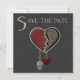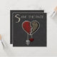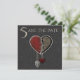 Um convite de Save the Date gótico: coração de joia gótica em vermelho e preto com caveira prateada em um fundo cinza escuro.