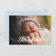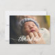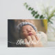 Cartão personalizado de anúncio para bebês com um texto elegante e moderno e branco "agradecido". Substitua a foto, a cor azul do fundo e os detalhes para personalizar para sua introdução especial ao parto.