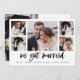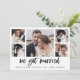 Este anúncio de casamento simples, preto e branco apresenta uma tipografia moderna, casual, que diz "casámo-nos", com uma multigrelha fotográfica de cinco fotografias na frente e mais uma no verso. Uma forma na moda para deixar amigos e familiares saberem sobre o seu elopeio ou que vocês amarraram o nó.