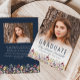 Uma bela borda floral de aquarela de flores silvestres decora a borda inferior deste cartão de anúncio de graduação de bolho de tendência. Na frente da placa, personalize a cobertura de texto azul do marinho em uma foto vertical do formando, com o nome do formando em script de escrita manual e o ano escolar e de classe em fonte sans serif. A parte de trás repete a borda da flor silvestre em um fundo azul marinho e apresenta uma segunda foto horizontal, com espaço para detalhes sobre suas conquistas de formandos e planos futuros. Uma boa escolha para segundo grau ou formandos.