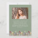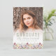 Uma bela borda floral de aquarela de flores silvestres decora a borda inferior deste cartão de anúncio de graduação de bolho de tendência. Na frente do cartão, personalize a camada de texto verde de sábio em uma foto vertical do formando, com o nome do formando em script de escrita manual e o ano escolar e de classe em fonte sans serif. O verso repete a fronteira da flor silvestre em um fundo verde sábio e apresenta uma segunda foto horizontal, com espaço para detalhes sobre suas conquistas de formandos e planos futuros. Uma boa escolha para segundo grau ou formandos.