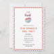 Convite de festas vermelho branco e azul de 4 de julho, com ilustração de maiô azul e branco vermelho de cor d'água.