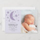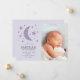 Cartão de anúncio de nascimento bonito com as suas próprias fotos de bebê. A carta apresenta as formas de lua e estrelas cheias de folhas de lavanda. Perfeito para uma foto de bebê dormindo. Sob a Lua e as estrelas é onde você pode adicionar os nomes do seu bebê e as estatísticas de natalidade. Uma segunda imagem pode ser adicionada à parte traseira do cartão juntamente com os nomes dos pais.