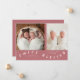 Cartão de nascimento branco com texto tipográfico que diz "duas vezes abençoado" no fundo com duas fotos na frente. Você pode adicionar uma terceira imagem no verso juntamente com as estatísticas de natalidade e a mensagem. O fundo é rosa.