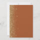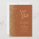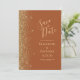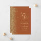 A borda esquerda deste elegante casamento moderno salve o cartão de data apresenta uma borda falsa dourada. O texto personalizável combina uma letra pálida de cor dourada, uma letra copperplate e uma letra itálico num fundo de terracota. O verso apresenta um terracotta e design dourado.