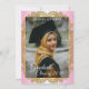 Parabéns únicos e modernos, formando de anúncio e cartão de convite de festas de celebração, com um clássico círculo clássico de mandioca cor de ouro brilhante em um padrão de gradiente de cor rosa-doce e verde-ombre branco. Com espaço para personalizar ou personalizar com uma foto, o nome do formando, ano de graduação, segundo grau e futuro nome da faculdade ou universidade. Deixe a família, amigos e vizinhos saberem que há um formando feliz pronto para conquistar o mundo, e convide todos a virem celebrar o feliz evento com vocês!