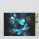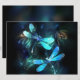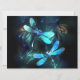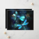 Duas libélulas transparentes, luminosas, turquesas, desenhadas artisticamente sobre fundo noturno, com algas e vagalumes luminescentes do lago. Dragonfly brilhante.