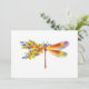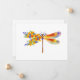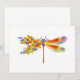 Pintura artificial, libélula floral em laranja e roxo contrastantes com papoila amarela, brilhante e florescente da Califórnia e flores silvestres azuis em fundo branco.