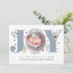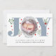 Joy azul com bagas Primeira foto de Natal Anúncio de nascimento de bebê Feriado. Mostra a palavra "JOY" com bagas vermelhas e verde enquanto em vez da letra "O" está a sua foto. As costas incluem bolinhas azuis empoeiradas.