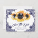 Navy blue and sunflower wedding save the date card featuring sunflower flowers, delicate floral lace, string lights and burlap hearts.