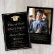 Elegant black graduation announcement with a gold grad cap, the graduate's name and their class year in a formal gold script, and their school, major and honors in classic gold typography. Add a photo on the back and personalize your message.