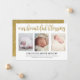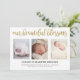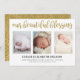 Cartão de nascimento elegante e simples com texto brilhante dourado que diz, "Nossa Bênção Bela" em letra de escrita manual e estilo caligrafia. Com 3 cartões de anúncio de colagem de fotos. Funciona melhor com fotos de orientação vertical ou de orientação vertical. Substitua as fotos por sua própria foto recém-nascida para personalizar este cartão.