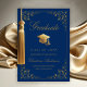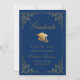 Envie este cartão de anúncio de formatura elegante para seus familiares e amigos para impressioná-los. Este design apresenta uma boina de graduado em ouro falso e tipografia em um fundo azul real emoldurado com uma borda botânica em filigrana de ouro falso. Personalize com seus próprios detalhes, nome, escola e ano. Criado por Susan Coffey.