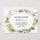 O Rosa Eucalyptus Greenery Dourado - Blush Pink Geométrico Moderno e Elegante Floral Watercolor Primavera Nós Mudamos Novos Cartões de Casa ou Novos Endereços - inclui uma bela e elegante tipografia de scripts com um verde botânico moderno para a celebração especial do Novo Lar ou Novo Endereço.