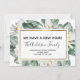 Palma Tropical Folga Uma Água Floral Moderna e Elegante Faux Rosa Gold Foil Geométrica Primavera. Movemos Novas Residências ou Novos Cartões - inclui uma bela e elegante tipografia de script com flores botânicas modernas e flores verdes para a celebração especial de Nova Casa ou Novo Endereço.