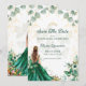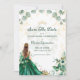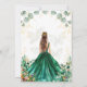 O convite da quinceañera apresenta um sonhador design de aquarela com um tema botânico suave. Ambos os lados exibem uma garota com um vestido esmeraldo verde e uma coroa ouro, que circulam entre flores verdes, coloridas e borboletas delicadas. O fundo é leve e arejado, decorado com folhas de eucalipto e sotaques florais de ouro. A frente inclui um texto elegante e fluente, enquadrado pela trabalho de arte etérea, enquanto a parte de trás se concentra apenas na cena encantadora, criando uma sensação de conto e romântico.