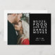 Na moda moderno salve os cartões postais de data são para o casal divertido que mal pode esperar para celebrar com sua família e amigos. Design de tipografia branca e preta com sua foto que diz: Booze, comida e maus movimentos de dança. Personalize o lado frontal do cartão postal com sua foto, nomes e data de casamento. Adicione seu endereço de devolução e detalhes adicionais do casamento à parte traseira do cartão postal.