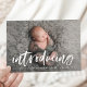 Cartão de anúncio de nascimento de foto moderno com a foto horizontal do recém-nascido do seu bebê com "apresentação" em uma camada branca de script de pincel. Personalize a frente dos simples anúncios de nascimento com o nome do bebê e as estatísticas de nascimento. A placa se inverte para exibir um padrão geométrico azul-céu.