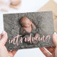 Cartão de anúncio de nascimento de foto moderno com a foto horizontal do recém-nascido do seu bebê com "apresentação" exibida em uma rosa claro, uma cobertura de script de pincel. Personalize a frente dos simples anúncios de nascimento com o nome do bebê e as estatísticas de nascimento. A placa se reverte para exibir um plano de fundo rosa sólido com espaço para fotos e texto adicionais.