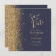 A borda esquerda deste elegante casamento moderno salve o cartão de data apresenta uma borda falsa dourada. O texto personalizável combina manuscrito pálido de cor dourada, fontes copperplate e itálico em um fundo azul escuro. O verso apresenta um design azul escuro e dourado.