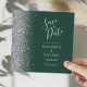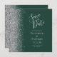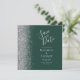 A borda esquerda deste elegante casamento moderno salve o cartão de data apresenta uma borda cintilante. O texto personalizável combina a escrita manual de cinzas prateadas, fontes copperplate e itálico em um fundo verde esmeralda escuro. O verso apresenta um design verde e prateado correspondentes.