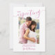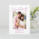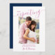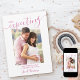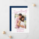 Anúncio personalizado de fotogravidez em cor rosa neutro e azul marinho. O modelo de foto é configurado para você adicionar sua própria foto, que é exibida no formato de retrato. "Esperar" está escrito em tipografia elegante escrita à mão e a mensagem de anúncio de gravidez é perfeitamente editável para você se adaptar com a data de vencimento do bebê e seus nomes. Uma design simples e moderna para compartilhar suas maravilhosas notícias.
