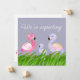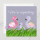 Compartilhe suas notícias de excelente com este bonito cartão de anúncio de gravidez Flamingo. Um cartão plano delicioso para enviar à sua família e amigos para avisá-los que estão esperando um bebê. A design apresenta cores aquáticas rosa e azul pálido, flamingos pais e bebês com um fundo púrpura pálido e texto branco, Todo o texto pode ser alterado para personalizar e personalizar com suas datas de vencimento e mensagem no verso. E muitas parabéns.