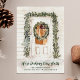 Anúncio comovente de feriado elegante com porta de frente de neve com uma coroa festiva e terra firme. "We'are Decking New Halls" é exibido em um script verde ousado com seu nome e endereço exibidos abaixo. A parte de trás do anúncio comovente do Natal apresenta um fundo verde com nevões brancas.