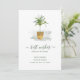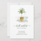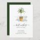 Cartão de anúncio elegante com design de aquarela, roteiro manuscrito e planta doméstica tradicional. Apresenta uma palma tropical num pote de plantas atrativo e lê "melhores desejos da minha nova casa", seguido do seu nome e do seu novo endereço.