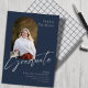 Este anúncio de graduação em forma plano de 5" x 7" apresenta uma fotografia em forma de arco na frente, sobre um fundo azul de marinho, com a inscrição de cinzas luminosas. Os marcadores incluem, nome do formando, nome da universidade ou universidade, o grau, a área de foco do grau e uma linha adicional para informações adicionais, como honras especiais.