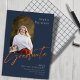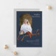 Este anúncio de graduação em formato plano de 5" x 7" apresenta uma fotografia em forma de arco na frente, sobre um fundo azul marinho, com a letra de cinza com a palavra "formando", em laranja. Os marcadores incluem, nome do formando, nome da universidade ou universidade, o grau, a área de foco do grau e uma linha adicional para informações adicionais, como honras especiais.