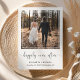 Anúncio de casamento simples e sofisticado ou para um casamento íntimo, ou convite para recepção ou festa pós-casamento. A frente apresenta sua fotografia em uma moldura quadrada recortada, "felizes para sempre" escrito em uma fonte moderna com floreios e seus primeiros nomes, data e local do casamento em tipografia moderna. No verso, personalize o anúncio do casamento e o convite para a recepção e adicione seus sobrenomes após o casamento em uma fonte com estilo de assinatura.