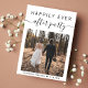 Mínimo elopemento moderno ou anúncio de casamento e convite para receber para informar a família e os amigos que você se casou em uma pequena cerimônia íntima de casamento, e convidá-los agora para uma recepção de casamento. A frente mostra sua foto do dia do casamento e "Feliz Festa Sempre" em uma mistura de simples tipografia e roteiro de tendências com balanços. Sob sua foto você pode adicionar seus primeiros nomes e a data do casamento. No verso, você pode personalizar sua mensagem em mais detalhes e adicionar detalhes de convites de parte ou recepção e seus nomes em um script semelhante a assinatura.