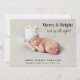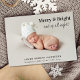 5 fotos bonitas, anúncio de natalidade na época de Natal. Na frente, a fotografia do seu recém-nascido preenche o cartão, e "Feliz e Brilho e para cima a noite toda!" é escrito em cima numa mistura de tipografia elegante e um roteiro de na moda (este texto pode ser movido na ferramenta design para se adequar à sua fotografia). Adicione o nome do seu bebê e as estatísticas de natalidade. No verso, adicione 4 fotos adicionais, um cartões de natal e seus nomes.