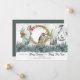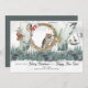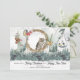 Cartão de Natal com inscrição decorativa e cartões de natal. Esta design de aquarela inspirada na natureza mostra a palavra JOY sobre uma floresta florestal e decorada com aves, bagas de inverno, verde festivo e cones de pínus.
