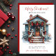 Esta rústica aquarela Feliz Natal nova casa para o cartão de anúncio de feriados com uma porta de madeira festivamente decorada com arbustos e árvores de pinheiro, uma coroa, e arcos de feriado vermelhos seria perfeito para enviar para seus amigos e família agora que você se mudou para uma nova casa. O sentimento é personalizável. Basta para que todos que conheces e amamos tenham o teu novo endereço. Ficarão tão animados com a sua grande jogada!