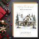 Esta rústica aquarela Feliz Natal, nova casa para o cartão de anúncio de feriados com uma casa festivamente decorada com neve, pinheiros, uma coroa, arcos vermelhos e árvores seria perfeito para enviar para seus amigos e família agora que você se mudou para uma nova casa. O sentimento é personalizável. Basta para que todos que conheces e amamos tenham o teu novo endereço. Ficarão tão animados com a sua grande jogada!